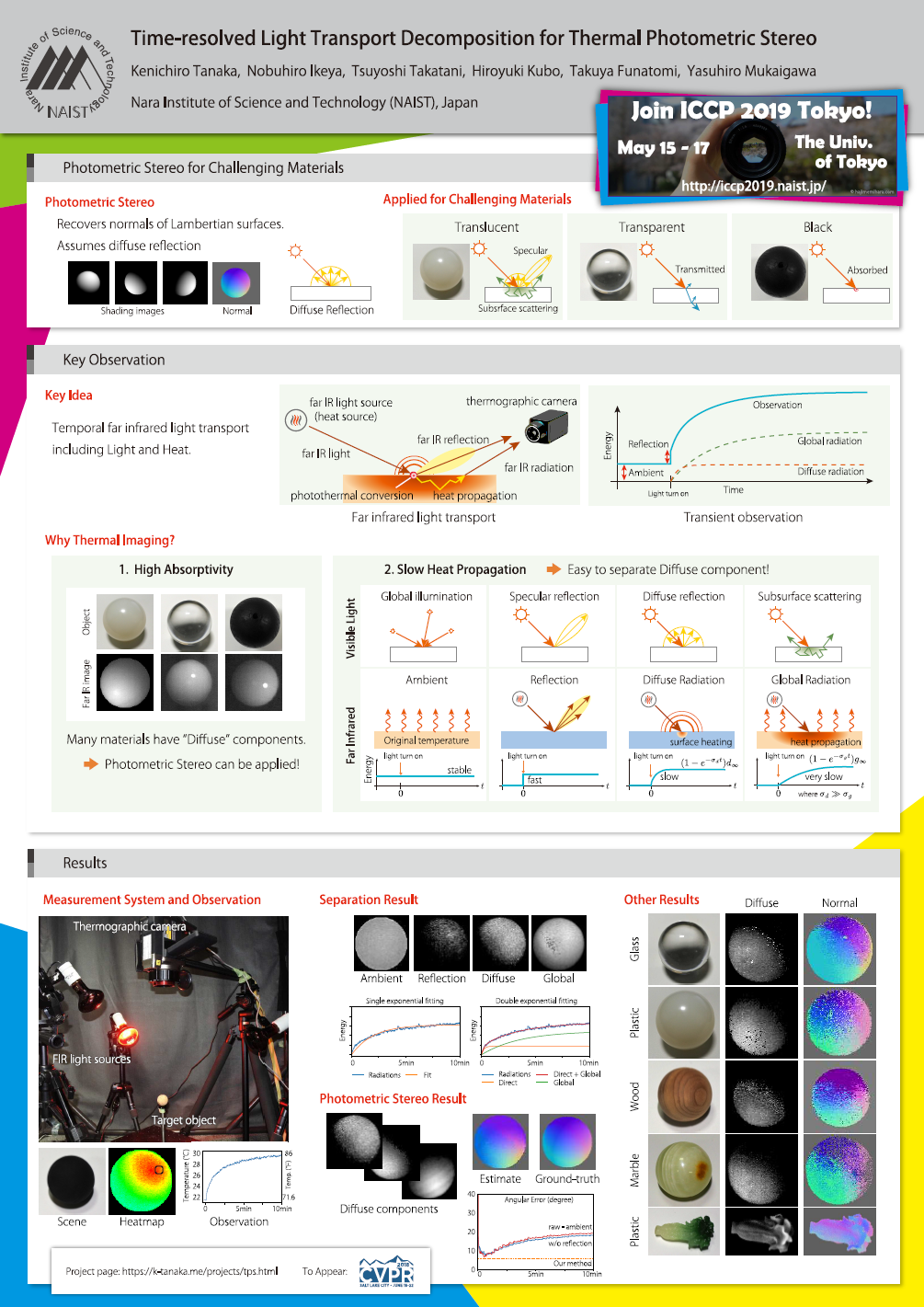 - We show that ordinary computer vision techniques can be straightforwardly applied to thermal images. As a proof of the concept, we propose a method to recover the surface normal using a photometric stereo after decomposing the far infrared light transport. The surface normal of challenging objects that have complicated optical effects can be recovered.